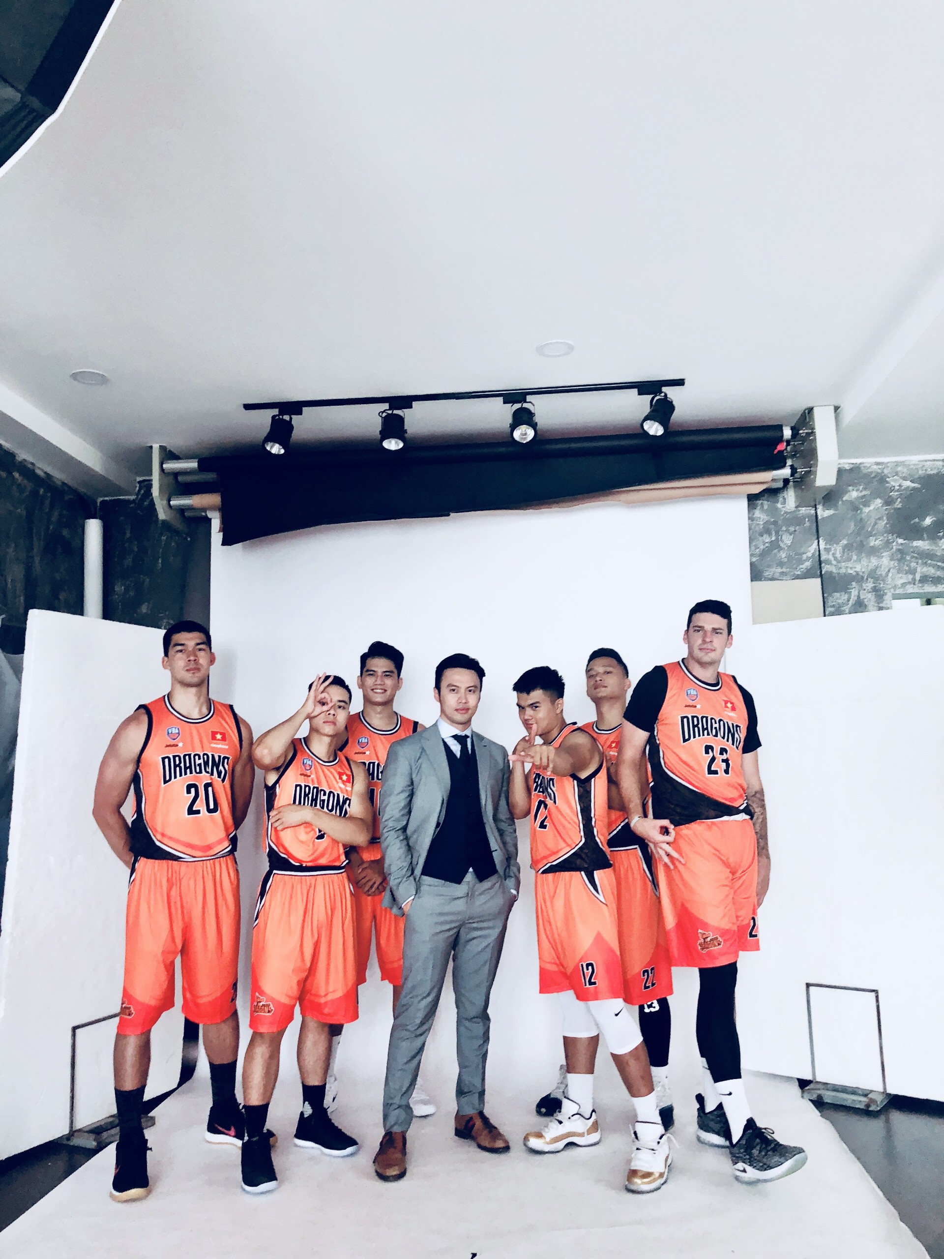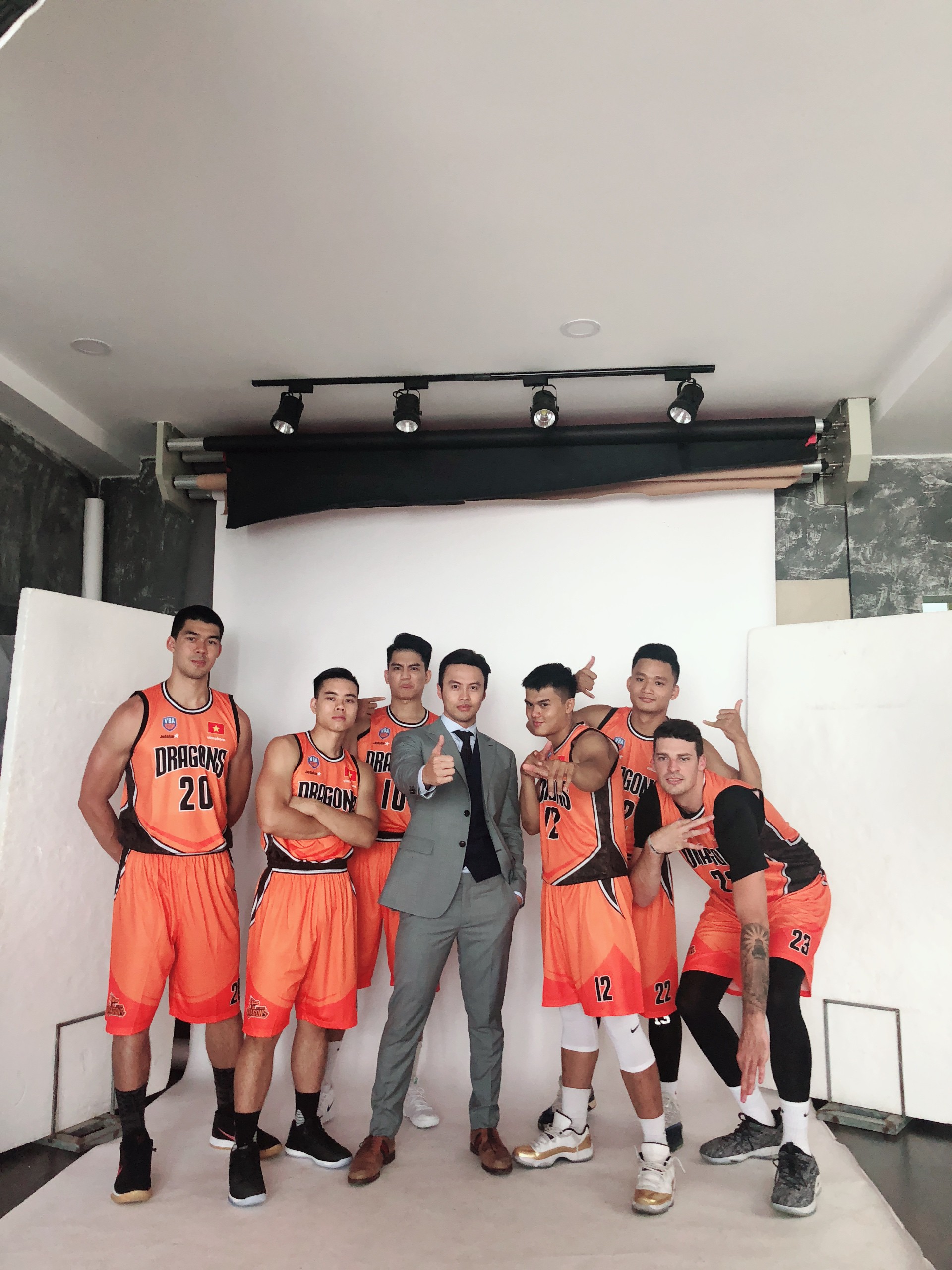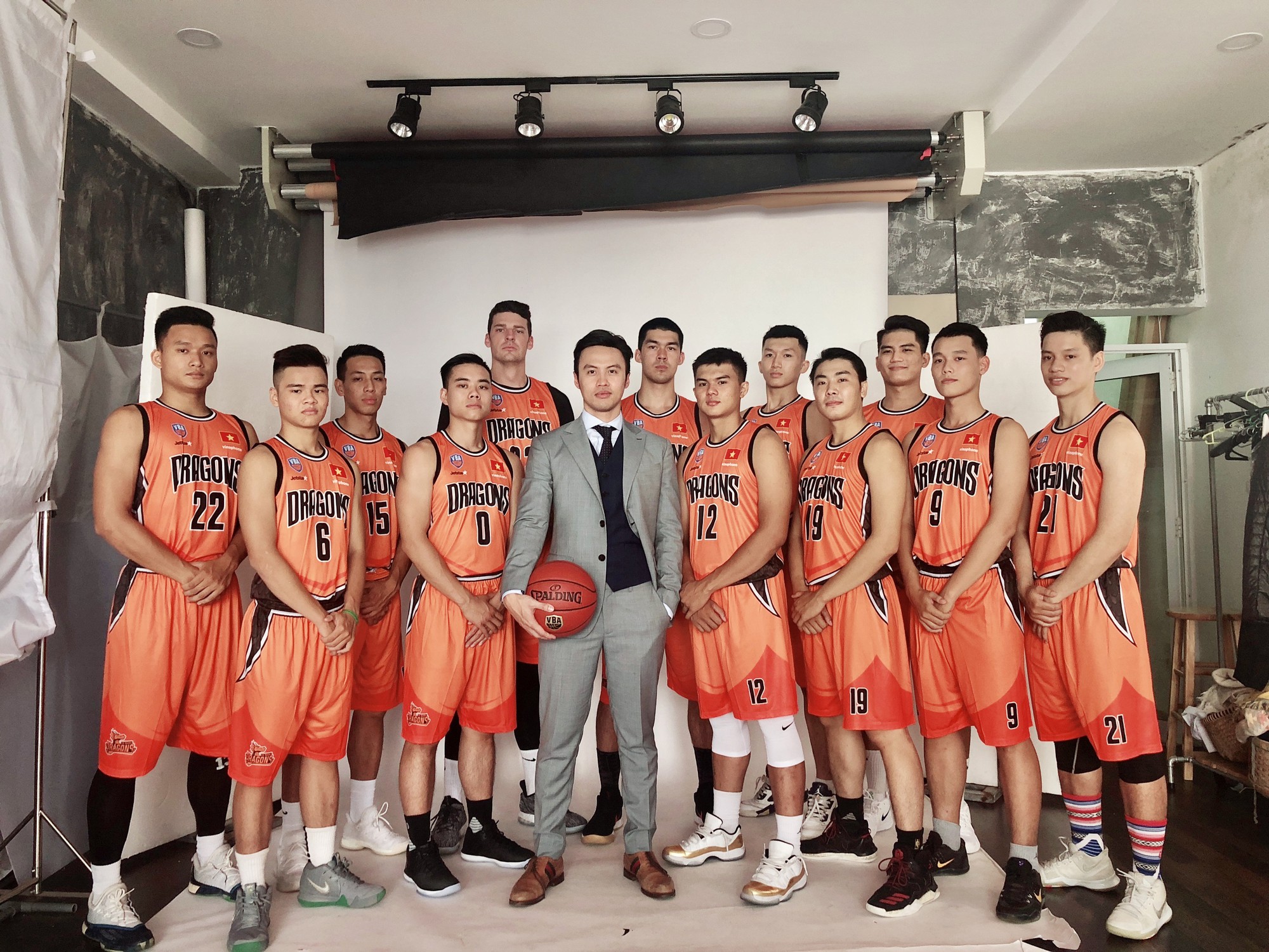Vào tối qua, Lê Đăng Khoa đã đăng lên Facebook cá nhân những khoảnh khắc hậu trường trong một buổi photoshoot với đội bóng của mình. Bình thường shark Khoa đứng một mình là đã đủ nổi bật, nhưng giờ xung quanh anh còn có thêm cả một lực lượng hùng hậu gồm 12 vận động viên bóng rổ chuyên nghiệp. Ai nấy cũng đều cao to, vạm vỡ và điển trai không kém gì ông bầu của mình.